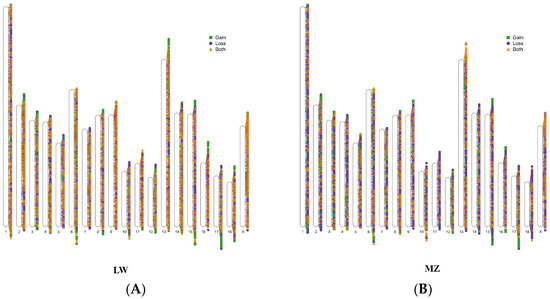 Whole-genome distribution of CNVRs and variation types in (A) LW and (B) MZ pigs. Green squares indicate the gain type, purple circles indicate the loss type, and yellow triangles indicate both types.
