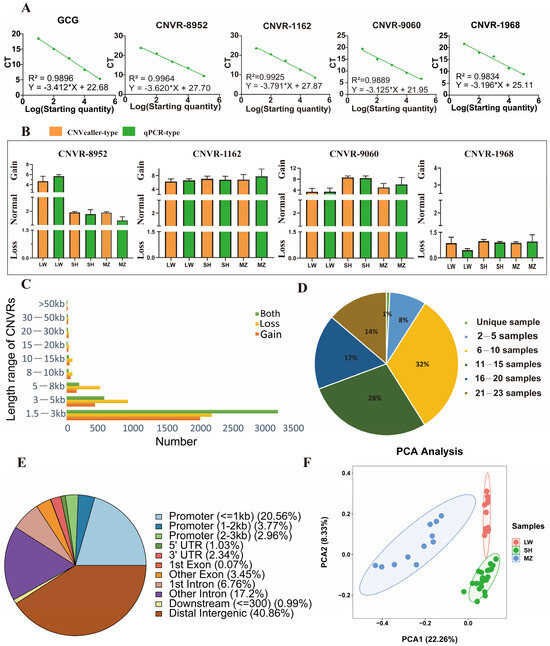 Descriptive statistics on CNVR type, CNVR length, genomic location, and frequency. (A) The standard curves of GCG, CNVR-8952, CNVR-1162, CNVR-9060, and CNVR-1968 were established according to the gradient concentration dilution method, respectively, and represent the amplification efficiency of the primers. (B) The CNV type between qPCR and CNVcaller assays in CNVR-8952, CNVR-1162, CNVR-9060, and CNVR-1968, respectively. (C) Length distribution of CNVRs, where the X-axis represents the number of CNVRs located in the length range, and the Y-axis represents the CNVRs’ length range. Green, yellow, and red represent both types, loss type, and gain type, respectively. (D) Frequency distribution of CNVRs. (E) Genomic location annotation of CNVRs. (F) PCA plot of LW, MZ, and SH pigs. Red, blue, and green colors represent the LW, MZ, and SH pigs, respectively. The variance proportions of PC1 and PC2 are 22.26% and 8.33%.