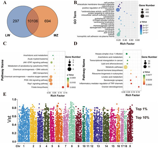Analyses of shared and breed-specific CNVRs. (A) Venn diagram of the CNVRs in LW and MZ pigs, showing that 10,106 CNVRs were found to be shared between LW and MZ pigs, and 297 and 694 breed-specific CNVRs were present in LW and MZ pigs, respectively. (B) GO enrichment analysis was performed on annotated genes in shared CNVRs. (C,D) represent annotated genes in breed-specific CNVRs of LW and MZ pigs, respectively, on which KEGG enrichment analysis was performed. (E) Manhattan plot, representing the VST values of all CNVRs. CNVRs with the top 1% (n = 110) VST values were set as the preliminary differential CNVRs between LW and MZ pigs.