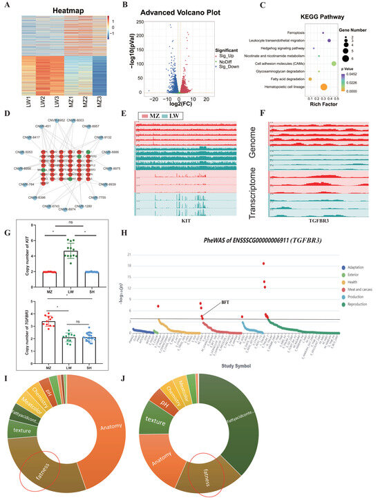 Multi-omics integrated analysis. (A) The heatmap represents a global expression of all genes in LW and MZ pigs. (B) The volcano plot represents the gene expression differences between LW and MZ pigs, where a total of 5317 genes were up-regulated and 3868 genes were down-regulated in MZ pigs relative to LW pigs. (C) KEGG enrichment analysis was performed on trans-eQTL effect genes. (D) Interactive network diagram between differential CNVRs and known genes with cis-eQTL effects. (E,F) represent the expression of KIT and TGFBR3 at the genomic and transcriptomic level of MZ and LW pigs, respectively. (G) Copy number of KIT and TGFBR3 in MZ, LW, and SH pigs, respectively (* p < 0.05, ns indicates no statistical difference). (H) The TGFBR3 gene is significantly associated with BFT in pigs. (I) The eQTL effect CNVRs overlapped with the pigs’ QTLs, in which “fatness” (area circled in red) accounts for 28.99% of the “meat” trait QTLs. (J) In total pig QTL data, “fatness” (area circled in red) trait QTLs account for 19.13% of the “meat” trait QTLs.