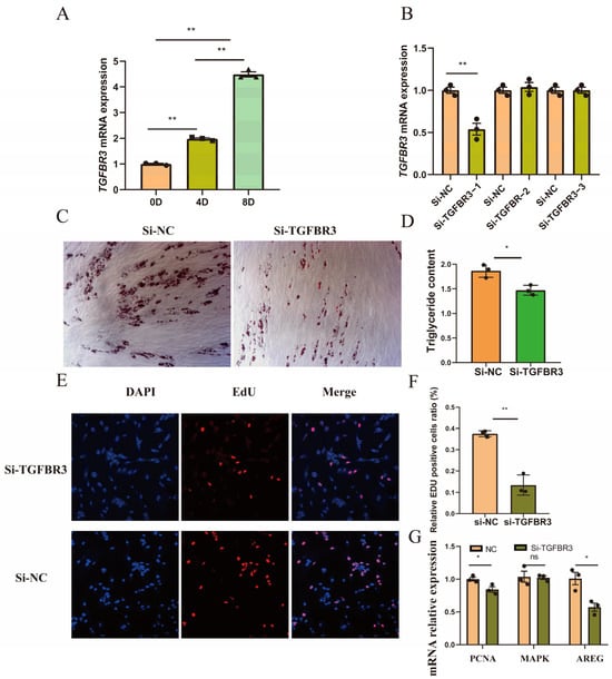 Decreased expression of TGFBR3 inhibited preadipocyte proliferation and differentiation. (A) The expression levels of TGFBR3 exhibit a gradual increase from 0 to 8 days post-induction (** p < 0.01). (B) si-TGFBR3−1 significantly reduced the expression level of TGFBR3 (** p < 0.01). (C,D) Oil red O staining and triglyceride content assays confirmed that decreased expression of TGFBR3 inhibited preadipocyte differentiation (* p < 0.05). (E,F) EdU staining on preadipocytes showed reduced expression of the TGFBR3 gene significantly decreasing the cell proliferation rate of preadipocytes (** p < 0.01). (G) The cell proliferation-related genes PCNA and AREG were significantly reduced with transfection of si-TGFBR3−1 (* p < 0.05, ns indicates no statistical difference).