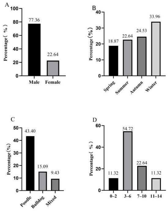 Epidemiology of WS dogs. (A) Gender difference; (B) Seasonal difference; (C) Breed difference; (D) Age difference.