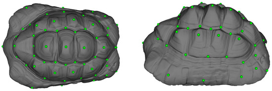 In this study, 3D geometric morphometric analysis was conducted, starting with creating a draft landmark set. The PseudoLMGenerator module within the Slicer program (version 5.2.2) was utilized for this purpose. A female Leopard tortoise of average size was selected as the reference specimen to create the landmark set. Points were evenly distributed on both sides of the carapace using a mid-sagittal plane. The spacing tolerance was set at 8%, and a template was generated based on this configuration. The template geometry dictated the shape of the estimated sampling template. Landmarks were then marked on the surface of the carapace. Subsequently, the regularity of the sampling was enhanced, resulting in the final landmark set (as shown in Figure 1 with green points). As a result of all operations, a total set of 59 landmarks was obtained.