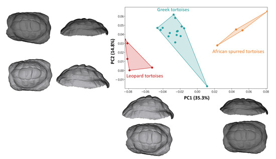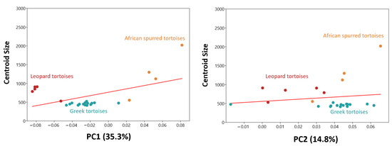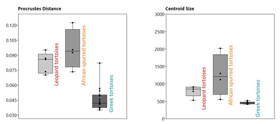 According to the centroid size results, the largest specimen was an African spurred tortoise, while the Greek tortoises were the smallest. Size variation was more significant among African spurred tortoise specimens than among other species.