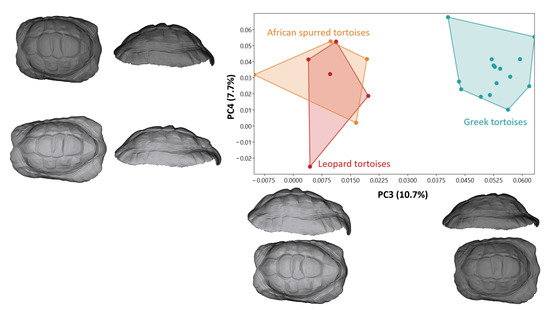 Although PC3 and PC4 together explained 18.4% of the total variation, in the PC3 values, Greek tortoises were distinctly separated from the other species (Figure 4). A higher PC3 value corresponded to a raised shape at the back of the shell, while a lower PC3 value indicated a raised shape at the front. In Greek tortoises, the front of the shell was higher, whereas in Leopard tortoises and African spurred tortoises, the back of the shell was higher than the front.