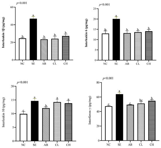 | Salmonella (log10 CFU/g) | 4.77 ± 0.01 b | 5.97 ± 0.01 a | 4.49 ± 0.02 c | 4.53 ± 0.02 c | 4.51 ± 0.01 c | <0.001 |