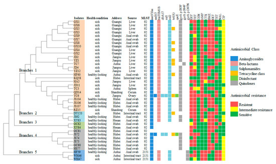 Figure 1. Genetic relationships, antimicrobial-resistance phenotypes, and the distribution of resistance-related genes determined in this study. The phylogenetic tree was constructed based on genomic SNPs to clarify the evolutionary relationships between strains. Genetic determinants of antibiotic resistance were systematically categorized according to their corresponding antibiotic classes and visually differentiated with color coding. Isolates clustered on five distinct branches of the phylogenetic tree, each marked by a unique color to facilitate differentiation: red (branch 1), light blue (branch 2), green (branch 3), gray (branch 4), dark blue (branch 5). STR, streptomycin; GEN, gentamicin; AMP, ampicillin; CTX, cefotaxime; SMZ, sulfamethoxazole; SXT, trimethoprim–sulfamethoxazole; TET, tetracycline; NAL, nalidixic acid; CIP, ciprofloxacin; ERY, erythromycin.