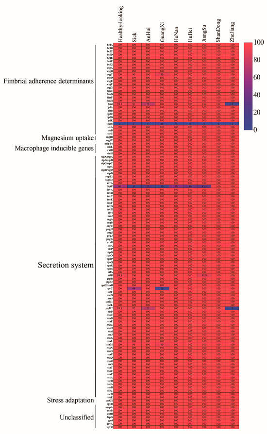 Based on the VFDB, a total of 117 virulence-related genes, involved in fimbrial adherence, secretion systems, stress adaptation, toxins, and so on, were identified (Figure 2). Among these, 109 genes were consistently present across all isolates from both healthy and sick chicken flocks: 69 genes associated with secretion systems (most of which were located in Salmonella virulence island 1 [SPI-1] and SPI-2); 25 fimbrial adherence genes; two magnesium uptake genes; one macrophage-inducible gene; one stress adaptation gene; one toxin gene; and 10 unclassified genes. Genes belonging to the Spv family enhance the ability of Salmonella strains to grow inside the endothelial cells of the reticulate system. The spvR and spvB genes were present in all the strains, whereas the spvC gene was found in 77.5% of strains. The gene encoding the type III secretion system effector protein SptP, which is crucial for the infection process of Salmonella, was identified in only 27.5% of the strains. Interestingly, sptP and spvC were more prevalent in S. Pullorum strains from healthy chicken flocks than in those from unhealthy flocks; only the sifB gene exhibited a higher carrier rate in the sick chicken flocks. The fimbriae-synthesis-related gene sefB was only present in one sick chicken. The macrophage-inducing gene mig-14 was detected in all strains.
