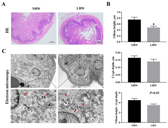 Effects of IUGR on jejunal morphology in newborn piglets. (A) HE staining (×40); (B) villus height, crypt depth, and villus height—crypt depth, n = 6; (C) scanning electron microscopy (5 µm, 1 µm), red arrow indicated endoplasmic reticulum (ER), black arrow indicated mitochondria (M). NBW: normal birth weight. LBW: low birth weight. HE: hematoxylin and eosin. * Means significant difference between two groups, p < 0.05.