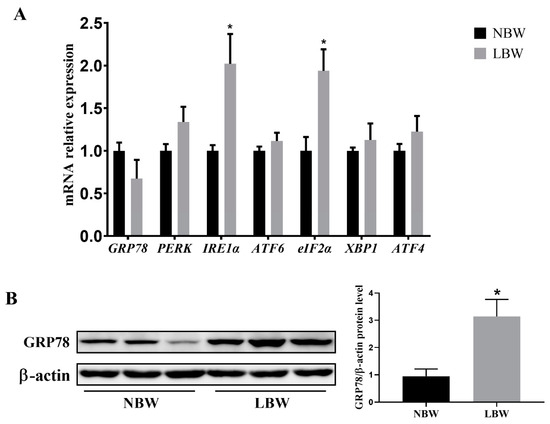 Effects of IUGR on jejunal ERS in newborn piglets. (A) mRNA levels of GRP78, PERK, IRE1α, ATF6, eIF2α, XBP1, and ATF4, n = 6; (B) protein abundance of GRP78, n = 3. NBW: normal birth weight. LBW: low birth weight. * Means significant difference between two groups, p < 0.05.