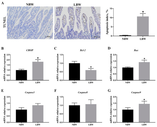 Effects of IUGR on jejunal apoptosis in newborn piglets. (A) Apoptosis index by TUNEL (100 µm); (B–G) mRNA levels of CHOP, Bax, Bcl-2, Caspase3, Caspase8, and Caspase9. NBW: normal birth weight. LBW: low birth weight. TUNEL: terminal deoxynucleotidyl transferase-mediated deoxyuridine triphosphate nick end labeling. * Means significant difference between two groups, p < 0.05, n = 6.