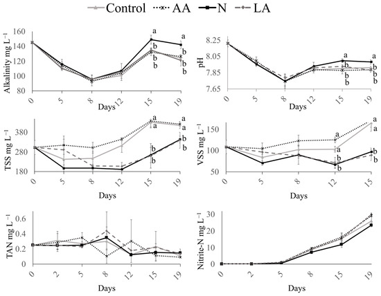 The highest nitrite concentrations observed were 24–30 mg L−1 at day 19. Reference [43] estimated that a concentration of 25.7 mg L−1 of nitrite is the upper safe limit level for rearing P. vannamei of approximately 4 g at 35 g L−1 salinity. Despite the amount of dry feed being reduced by 50% starting on day 16 to reduce the deterioration of the water quality, in the final days of the experiment, the previously mentioned limit was exceeded, meaning that the nitrite accumulation may have had a negative effect on the shrimp’s survival and growth. However, considering that the lower nitrite levels of the [N] group did not result in better growth compared to the other groups, as the highest RGR was observed in the [C] and [AA] groups and survival in the [N] group was also not statistically different from the [LA] one, it can be said that differences between treatments in the larval performances were likely to not have been caused by the accumulation of this compound.