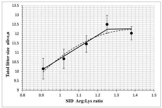 Fitted straight broken-line and quadratic broken-line regression models on the number of born alive piglets as a function of increasing standardized ileal digestible (SID) Arg: Lys in gestating sows. The optimum SID Arg: Lys ratio determined by straight broken-line model was 1.25 [Y = 12.181 − 6.1628 (1.25-SID Arg: Lys ratio) (closed line); R2 = 0.963, p < 0.05]. Using the quadratic broken-line model, the optimum SID Arg: Lys ratio was 1.39 [Y = 12.2198 − 9.8062 × (1.39 − SID Arg: Lys)2 (open line); R2 = 0.895, p < 0.05]. Data points (●) represent treatment means (n = 35, 34, 35, 36, 33).