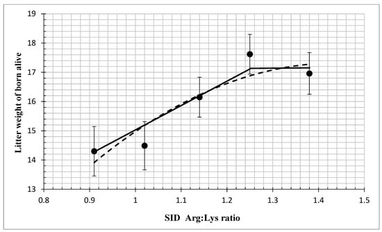 Fitted straight broken-line and quadratic broken-line regression models on the litter weight of born alive piglets as a function of increasing standardized ileal digestible (SID) Arg: Lys in gestating sows. The optimum SID Arg: Lys ratio determined by straight broken-line model was 1.25 [Y = 17.1289 − 9.1486 (1.25 − SID Arg: Lys ratio) (closed line); R2 = 0.92687, p < 0.05]. Using the quadratic broken-line model, the optimum SID Arg: Lys ratio was 1.44, [Y = 17.3295 − 12.0702 × (1.44 − SID Arg: Lys)2 (open line); R2 = 0.8593, p < 0.05]. Data points (●) represent treatment means (n = 35, 34, 35, 36, 33).