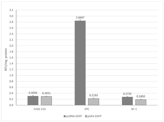 No CPE was observed in the cells transfected with pSAV-EGFP, as compared to those transfected with pcDNA-EGFP. EGFP was detected in pcDNA-EGFP-transfected cells (in all cell lines) after 24 h, while it was detected only after 2–3 days in the pSAV-EGFP-transfected cells. The number of the fluorescent cells peaked around 5 days after post-transfection (dpt) in the CHSE-214 cells and around 8 and 14 dpt in the EPC and KF-1 cells, respectively. The efficacy of the transfection with the pcDNA vector in EPC cells was sufficient, as a fluorescence signal was detected in approximately 80% of the cells. However, in the other two cell lines, the transfection efficacy was only around 10–20%. Using the large (approximately 12 kb) pSAV plasmid, the transfection efficacy was similarly low (10–20%) in all the three cell lines. The difference between the level of the gene expressions of the pcDNA-EGFP and the pSAV-EGFP vectors was not significant in the case of the salmon (CHSE-214) and carp (KF-1) cell lines (Figure 1). In the EPC cells, the EGFP signal produced by the pcDNA vector was almost ten times higher than that of the pSAV vector (Figure 1). The difference was highly significant in this case (p = 0.00013).