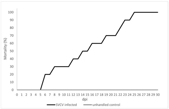 The preliminary SVCV infection experiment resulted in 100% mortality in the 3+ yr carp infected with 106 TCID50/mL by immersion, and no mortality was observed in the control group (Figure 2). The necroscopy showed the clinical signs of the SVCV infection: skin hemorrhages, exophthalmia, abdominal distension and petechial hemorrhages in the internal organs. The SVCV-specific RT-qPCR resulted in 100% PCR positivity of the samples.