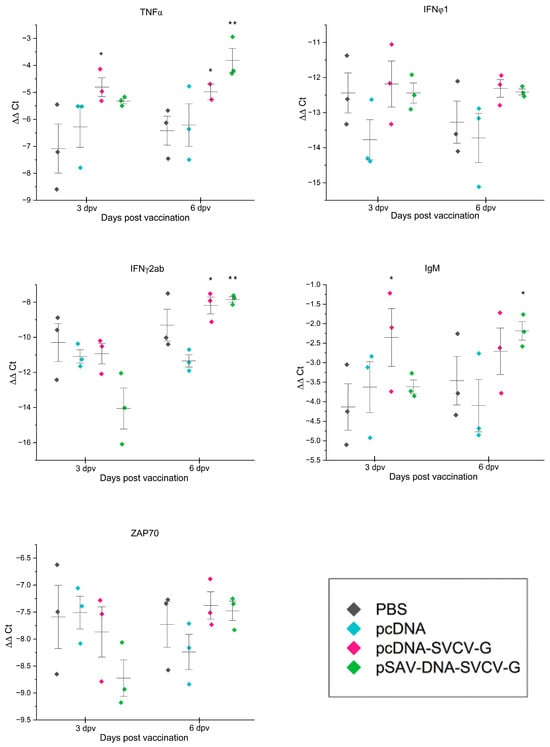 The relative expression levels of immune-related genes: the relative expression levels of genes tnfα, ifnφ1, ifnγ2a/2b, zap70, IgM in muscle (3 dpv) and in both muscle and spleen tissues (6 dpv) of the fish after immunization with pcDNA-SVCV-G and pSAV-DNA-SVCV-G, as well as control groups, which were injected with PBS and pcDNA empty plasmid. Fish muscles were sampled at the site of injection at 3 and 6 days post-i.m. vaccination. Analysis was performed with RT-qPCR and normalized to the housekeeping gene β-actin, and ΔΔCt values were calculated. Statistically significant differences: ** p < 0.05, * p < 0.1, between the DNA-vaccinated and the control groups determined by one-way ANOVA, followed by Dunnett’s test.