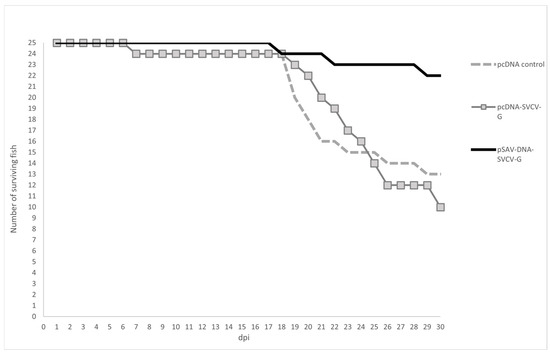 Vaccination and SVCV challenge: three-year-old common carp (n = 25/group) were vaccinated with the pcDNA empty plasmid control, pcDNA-SVCV-G or pSAV-DNA-SVCV-G at 20 °C (the dosage of 0.1 µg/g fish). Three weeks post-vaccination, the groups were challenged with SVCV by immersion bath with 6 × 105 TCID50/mL final virus concentration at 15 °C for 48 h. Survival rate was recorded from 0 to 30 dpi.