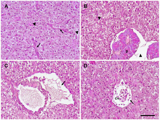 Histopathological changes in the liver of the control and vaccinated groups of common carp exposed to SVCV: (A) hepatitis (congested vessels—arrow) and edema (arrow head) in the liver of control fish; (B) inflammatory edema (arrow head) in liver parenchyma, while pancreas (p) remained intact (KT1); (C) perivascular infiltration with blood serum around the vein (arrow) (SDT4); (D) vacuolated and damaged endothelial cells (arrow) of the central vein (cv) and perivascular infiltration (SRT5). H&E staining. Scale bar: 50 µm.