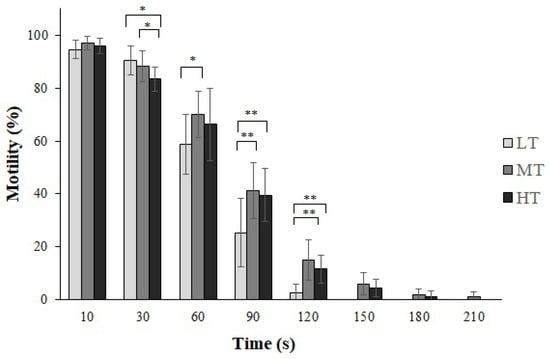 Percentage of goldfish (Carassius auratus) sperm motility at various temperatures. The temperatures are categorized as follows: 28 ± 1 °C (HT); 22 ± 1 °C (MT); and 16 ± 1 °C (LT). The values are mean ± SD. (*) p-value < 0.05; (**) p-value < 0.001.