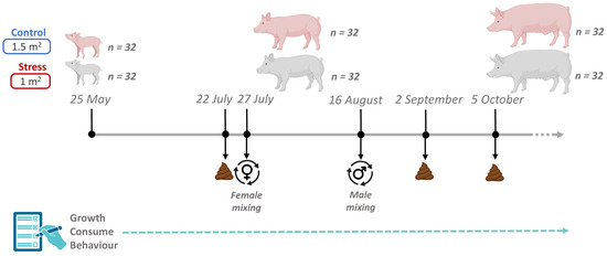 In the present study, a social stress model in pigs was used based on two handling procedures: half of the pigs tested were mixed twice during the growing period, and a reduced space allowance was maintained to induce more competition for resources. In comparison, the other half had more space available and were not mixed. This stress model was already tested with success in a previous study [29], where it was found that growing rates differ dramatically between stressed and not-stressed pigs. Therefore, although behavioral and phenotypic differences are also expected in the present study, its main objective is to check the fecal microbiota impacts of this long-term stress model in pigs to identify potential non-invasive fecal microbial biomarkers indicative of animal welfare. These biomarkers could offer insights into the dynamics of the gut microbial ecosystem under prolonged stress situations, to better understand the gut-brain axis, potentially leading to applications in both livestock production and even human health.