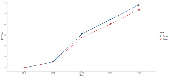 Comparative evolution across the experiment of mean of body weight (BW) and the standard error between control (solid blue line) and stress (dotted red line).