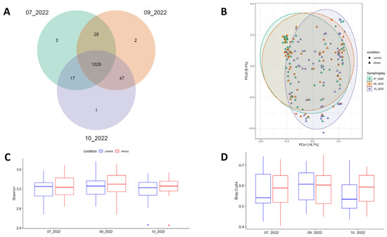 Number of ASVs commonly identified across the three sampling times (A), principal coordinates analysis (PCoA) plot based on the Bray-Curtis distance between samples (B), mean patterns of diversity index including Shannon-alpha (within samples) (C), and (D) Beta-diversity (between samples).