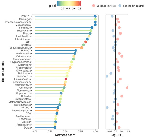 Top 40 genera according to NetMoss2 score and their corresponding abundance patterns. The corrected p-values are color-coded from blue (indicating the highest significance) to red (indicating no statistical significance). The adjacent panel on the right represents the differential abundance patterns, with red circles denoting genera enriched in the stress group and blue ones enriched in the control group.
