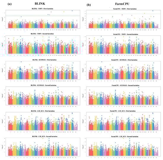 In this study, we used three variables from SCS, including LM_SCS, MAXSCS, and TOP3, to test the association using FarmCPU and BLINK models. The lactation average SCS has been used for many years to analyze genetic parameters for SCS and in association studies, as this trait effectively reflects the variation in somatic cell counts over the lactation, providing valuable insights into the udder health [7,12,13,38,39]. However, Green et al. [14] suggested that the maximum value of SCS (MAXSCS) improves the prediction of clinical mastitis better than the lactation average SCS. In addition, Yamaguchi et al. [40] and Koeck et al. [10] estimated higher heritability of MAXSCS than for lactation average SCS. The TOP3 trait was first used by Nani et al. [13] in an association study for SCS in Argentinian dairy cattle to capture different aspects of mastitis.