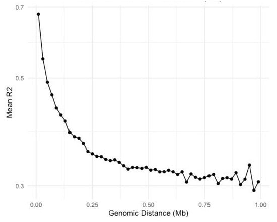 Linkage disequilibrium (LD) was quantified using the PLINK software v1.9 [26]. The LD measure r2 was computed for all SNP pairs on each chromosome following the method described by Hill and Robertson [27]. The formula for r2 is given by