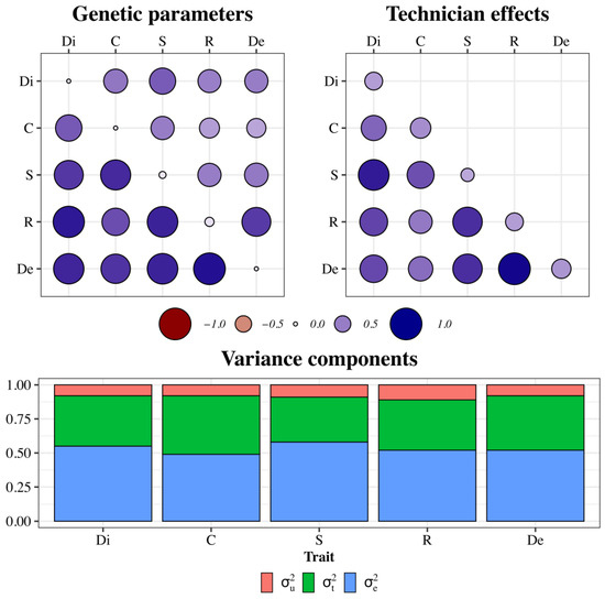 13] suggested using the appraiser/technician as a random effect for gait visual scores. They showed that this effect explained more phenotypic variance than the animal additive genetic effect, resulting in a low heritability (0.07–0.16). Thus, selecting for gait is challenging, and genetic gains are limited due to model and phenotyping quality. To overcome these problems, multiple-trait models (MTMs) are typically used to estimate variance components and predict breeding values for gait-related and morphological traits [
