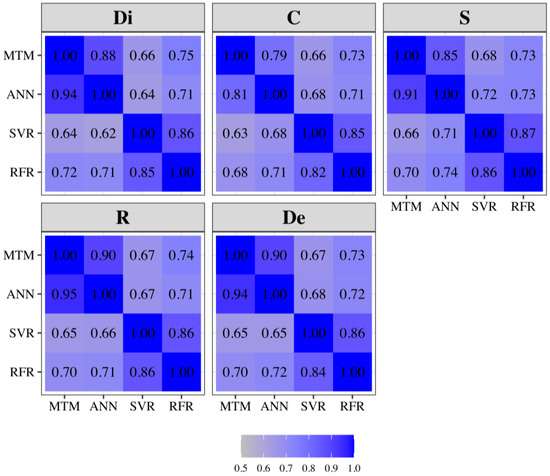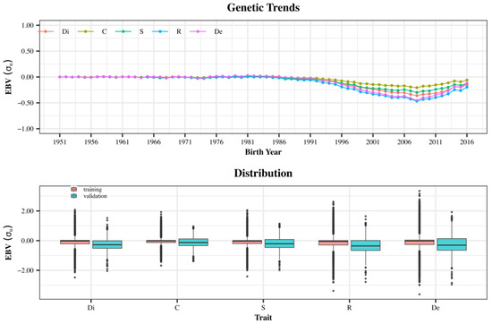 67]. The rank of the focal animals changed across all methods, and the highest rank correlation was found between the ANN and MTM (followed by RFR and SVR) across all traits. Predictions from the ANN (followed by RFR) showed the highest under-dispersion. If selection decisions are based on the EBV from MLTs, one should consider that re-ranking may impact genetic trends, at least at the beginning.