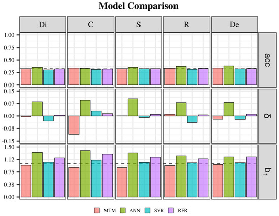 It is possible that the MTM predictions did not have enough theoretical accuracy to train alternative models. MLTs might be trained with the “noise” associated with each animal’s EBV if that is the case. That could explain the bias and dispersion increase for some traits when using MLTs. The reduced information and data structure can explain the lack of theoretical accuracy. The maximum values of theoretical accuracy (from MTM) were 0.56 (dissociation), 0.56 (comfort), 0.57 (style), 0.58 (regularity), and 0.57 (development). Another possibility is that the OLS solutions for the fixed effects were not well estimated, carrying some extra level of uncertainty to the MLT.