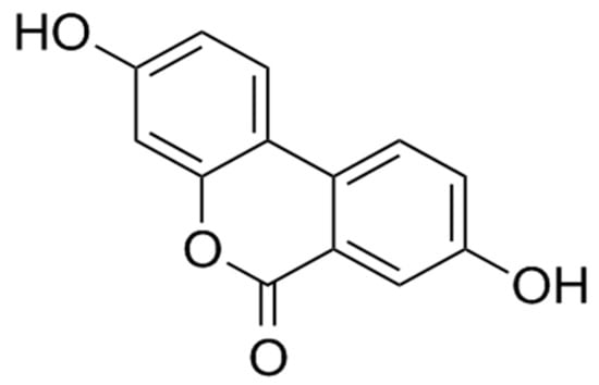 Urolithins are natural compounds produced by the gut microbiota from ellagic acid and ellagitannins found in fruits such as pomegranates, strawberries, and nuts [1]. Urolithin A (UA), also known as 3,8-Dihydroxyurolithin (C13H8O4) (Figure 1), is one of the most important compounds in this group [1]. Recently, several tests were conducted to investigate the activity and safety of UA isoforms. In vitro and in vivo studies (mice and human) have shown that UA has a good bioaccessibility and safety profile, with the potential to modulate oxidative stress and recover tissue damage through different mechanisms [2,3,4,5,6,7].