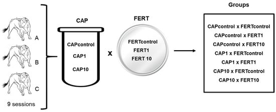 Figure 2. Experimental design of the second experiment to study the effect of UA in the process of the capacitation of bovine spermatozoa and fertilization of oocytes. UA was added to the capacitation medium (CAP) and/or the fertilization medium (FERT) at the concentration of 0 (control), 1, and 10 µM, totalizing seven groups. (A—Bull A; B—Bull B and C—Bull C).