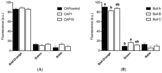 Analysis of sperm quality can be achieved through accurate measures of sperm mitochondrial functionality [13,16] and are evaluated by measuring the MMP. Results of MMP are represented in Figure 3A without any significant effect of UA (p ≥ 0.05). However, bull A has presented more spermatozoa emitting red-orange fluorescence (p = 0.01) and few emitting green fluorescence (p = 0.004) when compared to bull B (Figure 3B).