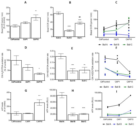 The OCR is a crucial indicator of mitochondrial activity, which reflects alterations in the electron transport chain [13,27]. Results showed that UA tended to increase basal OCR regardless of the concentration (control = 32.4 ± 4.19 pmol min−1; CAP1 = 43.6 ± 7.35 pmol min−1; and CAP10 = 53.3 ± 9.45 pmol−1 min−1) (Figure 4A). A significant effect of the bull (p < 0.001) on the OCR of capacitated spermatozoa was identified, with bull A presenting the highest OCR (Figure 4B), that was also the highest for capacitated spermatozoa from control and CPA1 treatments but not for CAP10 (Figure 4C).