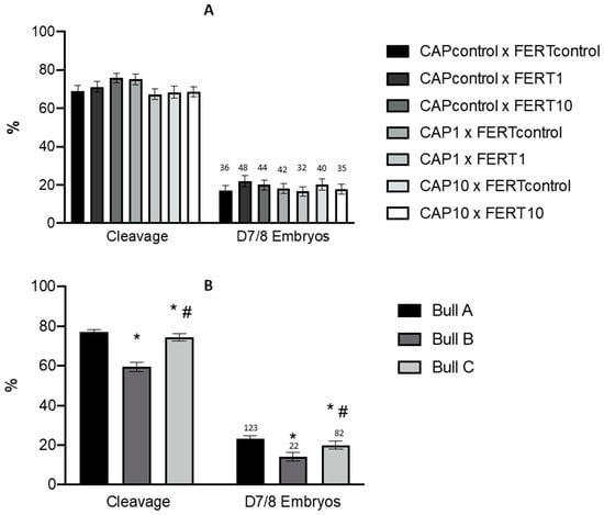 Effect of different concentrations of UA during capacitation and/or fertilization processes (A) and bull (B) on cleavage and embryo production rates (9 sessions). The data are presented as the mean value ± standard error of the mean and the number (n) of embryos. CAPcontrol: capacitation medium without supplementation; CAP1: capacitation medium supplemented with 1 μM of UA; CAP10: capacitation medium supplemented with 10 μM of UA. FERTcontrol: fertilization medium without supplementation; FERT1: fertilization medium supplemented with 1 μM of UA; FERT10: fertilization medium supplemented with 10 μM of UA. A, B and C represent the three bulls used in this study. * # indicate significant differences (p < 0.05). Numbers above bars represent the number of produced embryos.