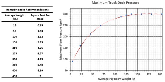 Presentation of a body weight–space required recommendation in tabular format to the same recommendation presented as a body weight vs deck pressure maximum for transporting all weights of pigs. National Pork Board space in trailer table (left) [19] (p. 27) and the same data in a maximum floor pressure graph (right). The table is a reproduction of part of the truck loading recommendations by the NPB TQA humane transport program (original table goes to 550 lb). Each line in the table gives a mass and an area, the units required to calculate pressure. The blue points on the graph to the right are the average weight (lb) divided by the square feet per head, giving units of pressure, mass/area. The pressure value converted into metric units is graphed against the body weight for each line in the table. The small red dots are the result of a curve-fitting program within the graphics options in MS Excel (smoothing of last 3 weight recommendations). The table gives 8 useful pieces of information relating average body weight and maximum deck pressure (flat after 150 kg), while the graph provides infinite information relating live individual body mass to safe maximum deck pressure. Recommendations presented as weight–space tables can be checked for internal agreement by transforming them into a pressure graph and examining goodness of fit using any curve-fitting software. The internal agreement for the first six points in this table is perfect, considering the recommendation is truncated at two decimal points. This level of precision suggests that the table’s weight range of 12–450 pounds (5–204 kg) was generated from a formula, although no reference or formula is given and heavier weights diverge from a smooth line and show more scatter.