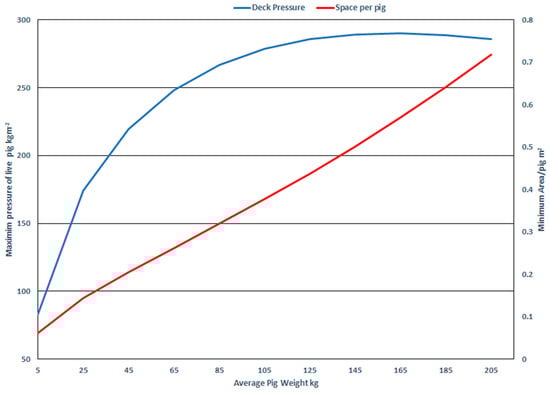 By 2009, it was generally accepted that the minimum area per pig in transport (standing room only) was approximated by a k value of 0.020 and for simultaneous group sternal recumbency by a k value of 0.027 [47]. This recommendation for transport has been retained in current EU opinion as standing-room-only pigs in transit is estimated by a k value of 0.027 [13] (p. 88), which is 0.62 m2 per animal and 177 kgm−2 for a 110 kg market pig (Figure 4). However, the 2005 regulation permits floor pressure up to 235 kgm−2 for 110 kg market-weight pigs [17] (p. 31).
