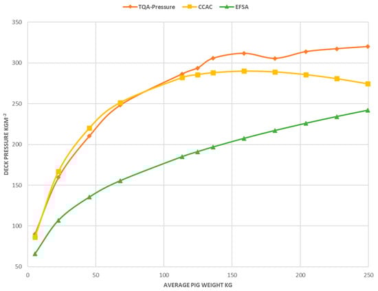 Graphical representation of maximal floor pressure recommendations for group-loaded pigs in transit from 5.5 to 250 kg from three sources. The green line is from the EFSA recommendation (Area = 0.027XWeight2/3) [13] (p. 88) and converted into equivalent truck deck pressure. The red line (TQA (total quality assurance) Pressure) is from the National Pork Board (US). Recommendations are given in the table [19] (p. 27), and for this graphic, converted to maximum metric pressure units from transport space recommendations. The yellow line is the CARC recommendation prediction formula in the Canadian Agri-Food Research Council maximum floor pressure for pigs in transit 2001 [18], P = (37.53)(0.9969)W(W0.5008), where P is trailer floor pressure in kgm−2 and W is average pig weight in kg. This is a Hoerl formula in the power-law family generated from curve fitting to observational data [21]. The markers are at irregular body weight intervals as the tabular data from the National Pork Board (NPB) recommendations have variations in body weight intervals (see Figure 1).