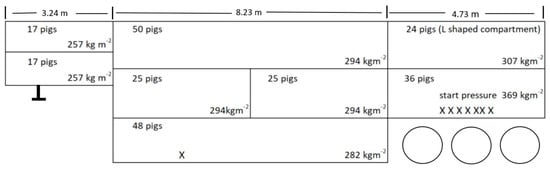 Location of dead pigs (X) identified on a warm summer day after travelling at least 16 h in western Canada. The bottom rear compartment was loaded at 369 kgm−2 and pigs died until the floor pressure of live pigs had dropped to 297 kgm−2. No deaths occurred in four central compartments at a floor pressure of around 295 kgm−2. The lengths of trailer compartments are above the image. Standard Canada–US–Mexico livestock trailers have an internal width of 2.53 m.