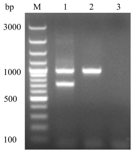 The PCR reaction system, with a total volume of 25 μL, included 2.5 μL of 10× e-Taq Reaction Buffer, 1.5 μL of 2 mM dNTP Mix, and 0.25 μL of Solg™ e-Taq DNA Polymerase. For detection, 1 μL of the forward primer DH1-VP1-C1 (10 pmol) and 1.5 μL of the reverse primer DH1-VP1-C2 (10 pmol) were used, along with 3 μL of the MAMA-F1 primer (10 pmol) designed for distinguishing between the wild-type and vaccine strains. The remaining 13.25 μL consisted of ddH2O. The PCR reaction conditions were as follows: initial denaturation at 94 °C for 5 min, followed by 35 cycles of denaturation at 94 °C for 1 min, annealing at 63 °C for 1 min, and extension at 72 °C for 45 s. The final extension step was conducted at 72 °C for 15 min. The amplified DNA was analyzed via electrophoresis on a 1.5% agarose gel.