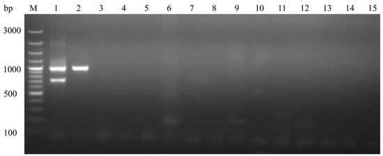 The BLAST search results showed that the detection primers used exhibited 100% homology with the DHAV-1 sequence. However, the distinguishing primer MAMA-F1 did not exhibit 100% homology with any sequence. Except for the additional introduced mismatch site, the primer showed 100% homology only with the HSB-P100 sequence, demonstrating its high specificity. During validation of the PCR method using DNA or RNA extracted from DHAV-3, DEV, DPV, AIV, DTMUV, RA, PM, APEC, CP, MG, and MS, no target fragments were observed, confirming the specificity of the method. The assay showed no cross-reactivity with the 12 common viral, bacterial, and mycoplasmal diseases in ducks (Figure 3). These findings indicate that the developed MAMA-PCR assay, designed specifically for DHAV-1, exhibits excellent specificity.