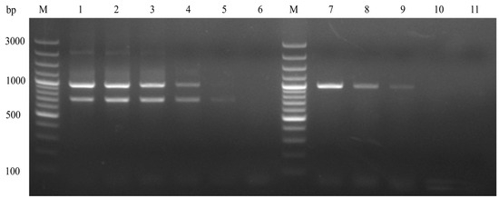 Sensitivity test of MAMA-PCR. M: 100 bp DNA marker; Lanes 1~6: vaccine strain 103.5~10−1.5 ELD50/mL; Lanes 7~10: wild-type strain 104.3~101.3 ELD50/mL; Lane 11: negative control.