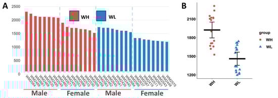 The average body weight of Wumeng black-bone chickens at 160 days of age was 1675 ± 308 g (n = 58). The Shapiro–Wilk normal distribution test indicated that the body weights conformed to a normal distribution (W = 0.97, p = 0.1, Supplementary Figure S1). The average body weight of the WH group was 1790 ± 393 g (n = 16) and significantly (p < 0.05) higher than that of the WL group (1459 ± 272 g, n = 16) (Figure 1A,B and Supplementary Table S1).
