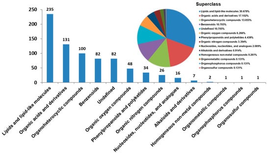 Metabolite types in the serum metabolome of Wumeng black-bone chickens. A total of 13 types of metabolites and some unclassified metabolites were identified. The number above the column is the number of metabolites of each type. The pie chart at the top right illustrates the proportion of metabolites in each superclass.