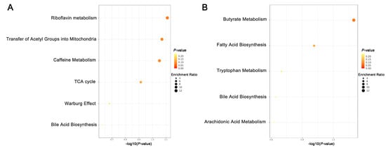 Enrichment analysis of metabolic pathways of serum differential metabolites in high- and low-body-weight groups. (A) High-body-weight group; (B) low-body-weight group.