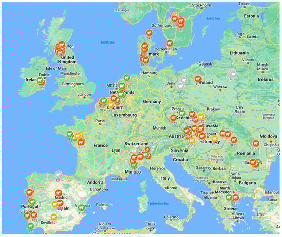 A map describing the sampled farms (Figure 1, created in Google maps) shows clustered sampling in some countries. For seven farms, the biosecurity information was not completed. From an additional seven farms, the individual calf sample information was missing essential data, such as age at the time of sampling, thus excluding their use in the study. The data presented here were for neonatal calves from 113 farms and for weaned calves from 116 farms. The results from multilevel models may have a varying number of calves included due to missing explanatory variables.