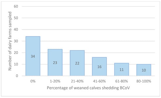 Number of herds (of 116) stratified by percentage of weaned calves shedding BCoV.
